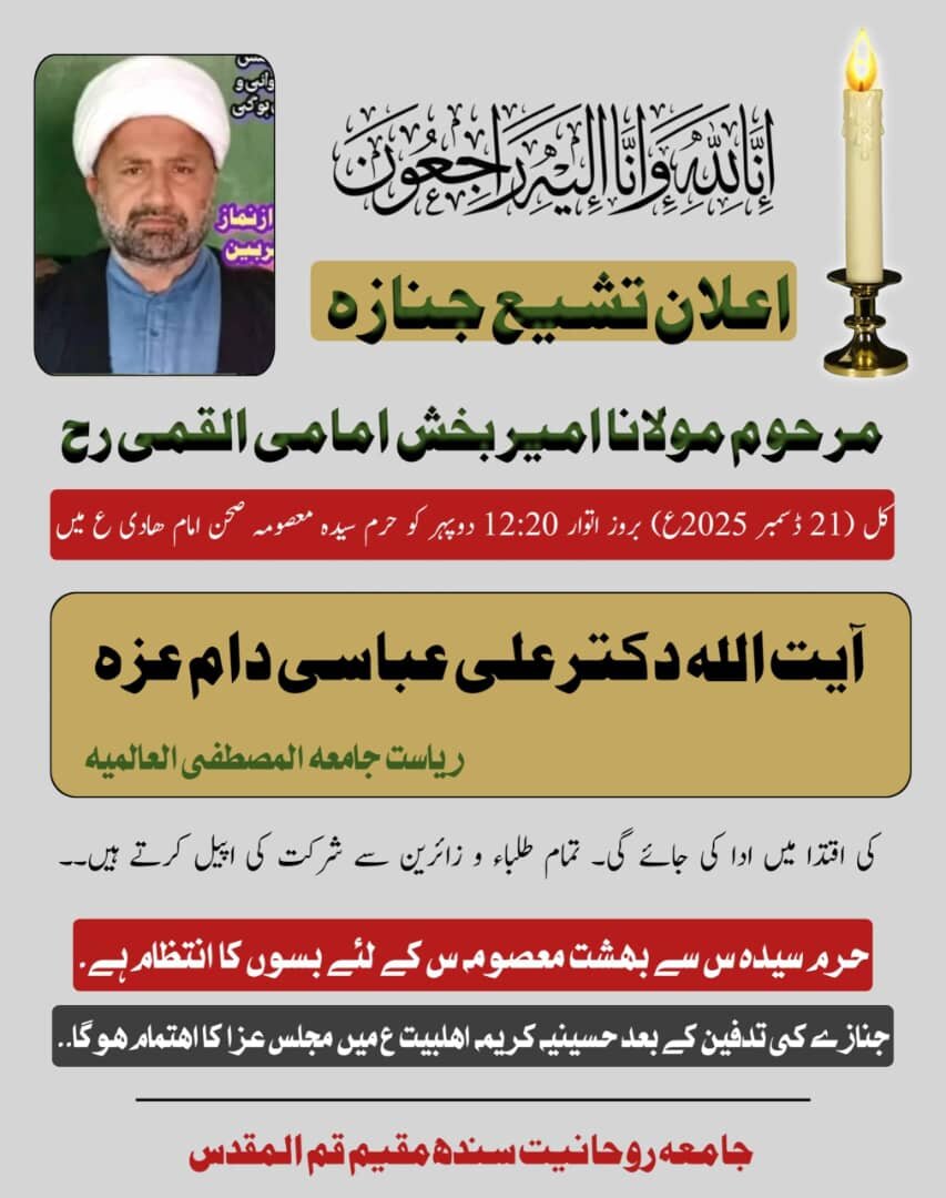 اہل بیت (ع) نیوز ایجنسی ابنا کے مطابق، حوزہ علمیہ قم کے فاضل طالب علم حجت الاسلام والمسمین مولانا امیر بخش مجیدانو کی نمازِ جنازہ حرمِ مطہر حضرت فاطمہ معصومہ سلام اللہ علیہا میں ادا کر دی گئی۔ نمازِ جنازہ میں علما، اساتذہ، جامعۃ المصطفی العالمیہ کے طلبہ، پاکستانی و دیگر ممالک سے تعلق رکھنے والے حوزوی افراد  کی بڑی تعداد نے شرکت کی۔