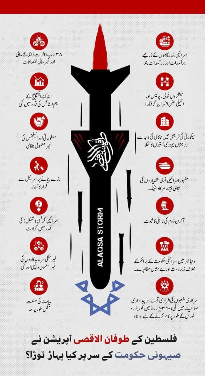 اہل بیت(ع) نیوز ایجنسی کے مطابق، فلسطین کی اسلامی مقاومت تحریک "حماس" کے مجاہدین نے 7 اکتوبر 2023ع غاصب اور مجرم صہیونی ریاست کے خلاف اپنی کاروائی کا آغاز کیا۔ اس کاروائی میں آج سے دو ہفتے قبل کی رپورٹ کے مطابق ہزاروں صہیونی ہلاک ہو گئے ہیں۔ مقاومت کے حملے جاری ہیں لیکن صہیونی اعداد و شمار کو صیغہ راز میں رکھ رہے ہیں۔ جو کچھ سامنے آیا ہے اسے آپ اس انفوگرافی میں دیکھ سکتے ہیں۔/ 110